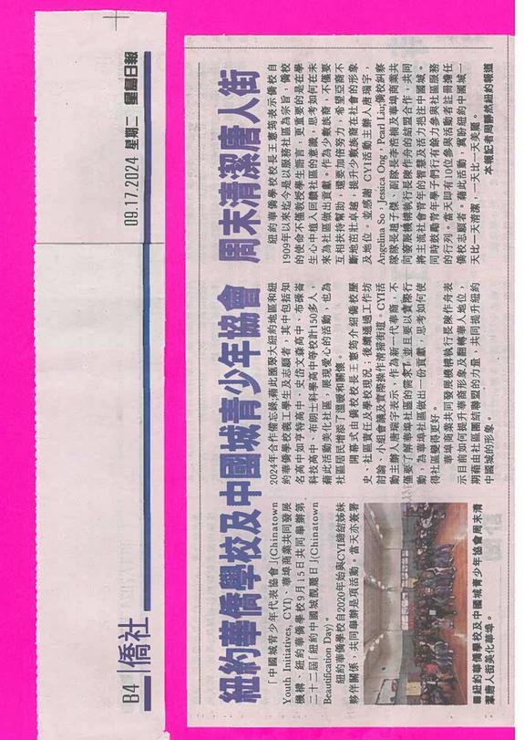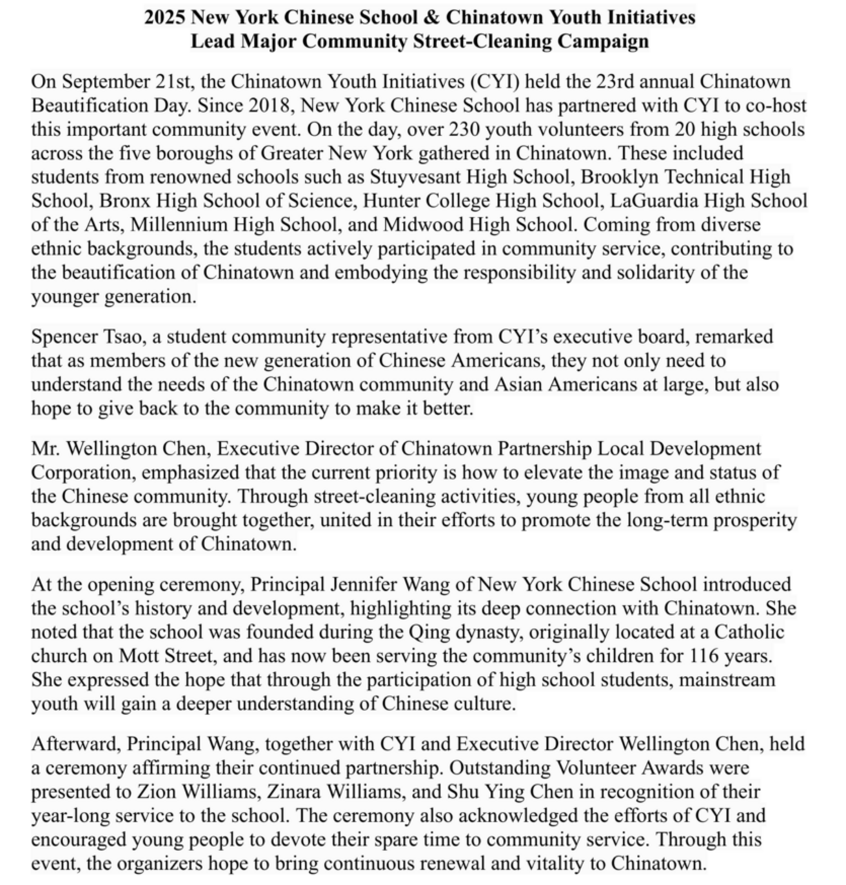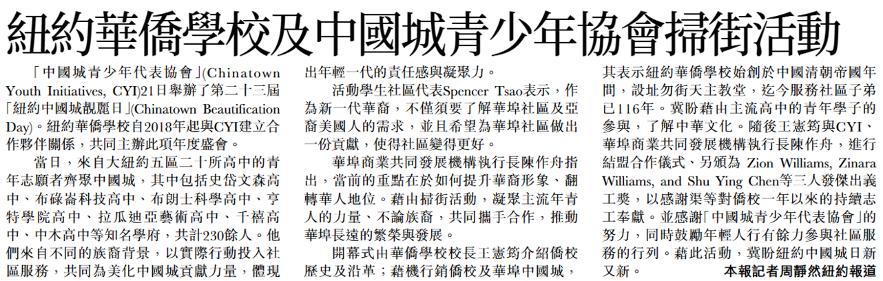 On September 15, the Chinatown Youth Initiatives (CYI), the Chinatown Partnership, and the New York Chinese School co-hosted the 22nd "Chinatown Beautification Day." Since 2020, the New York Chinese School has partnered with CYI to organize this event. A memorandum of cooperation for 2024 was also signed that day, bringing together over 150 volunteer students and community members from across New York City, including well-known high schools such as Hunter College High School, Stuyvesant High School, Brooklyn Technical High School, Bronx High School of Science. This event beautifies the community of Chinatown and shows love, warmth and care to the community.