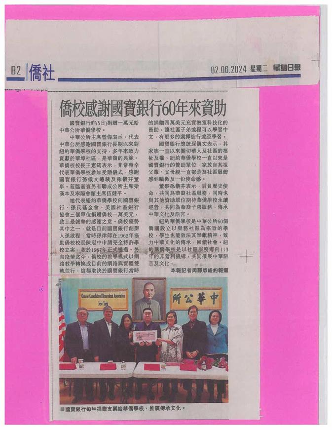 農曆新年前夕,國寶銀行為紐約華僑學校提供了1萬元的捐款。捐款儀式在曼哈頓華埠的紐約中華公所舉行,中華公所主席曾偉康、華僑學校校長王憲筠、國寶銀行總裁孫儀文、董事孫儀芬、美東聯成公所主席梁漢本和紐約台山寧陽會館主席伍健平出席。 孫儀文介紹,從她的父輩時代開始,華僑學校就是國寶銀行的長期贊助對象,而她的家族與華僑學校的淵源更可追溯至60年前,1962年,當時還是律師的國寶銀行創辦人孫啟誠,就積極幫助學校申請完全特許學校的立案。 王憲筠表示,疫情爆發以來,學校能夠順利開展線上教學,得益於國寶銀行價值4萬元的網路設備,使社區華人子弟能夠堅持學習中文,並有了更多種學習方式的選擇。曾偉康表示,國寶銀行多年來堅持貢獻華埠社區、支持華僑學校,是美國華裔資本的典範。