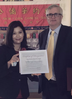 王校长回忆起学校的峥嵘历史时说:“我觉得上帝爱这所学校,我们也按照基督教义运营着作为一个非营利机构的学校。”她表示,学校最初借用当地教会的临时空间得以办学,自创办以来得到了华人社区的巨大帮助和支持。纽约州参议员卡凡纳为纽约华侨学校校长王宪筠颁发嘉奖状。图片由纽约华侨学校提供