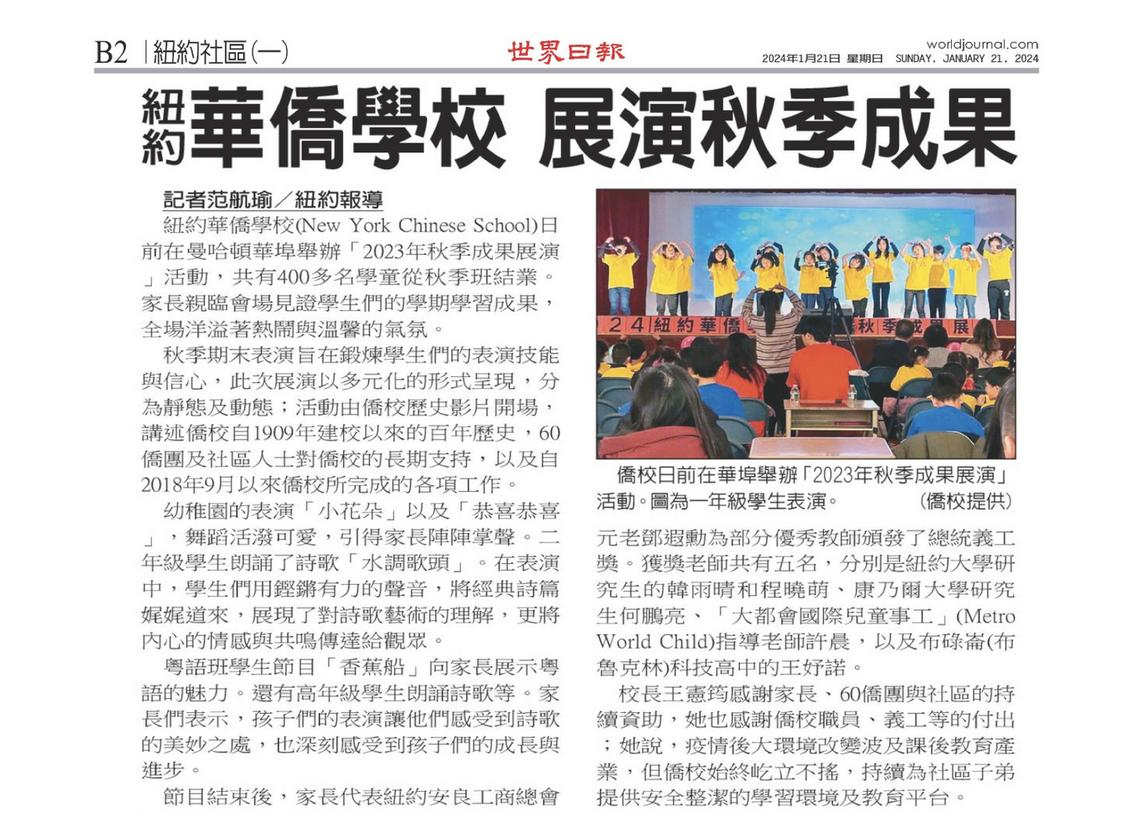 紐約華僑學校(New York Chinese School)日前在曼哈頓華埠舉辦【2023年秋季成果展演】活動,共有400多名學童從秋季班結業。 家長親臨會場見證學生們的學期學習成果,全場洋溢著熱鬧與溫馨的氣氛。