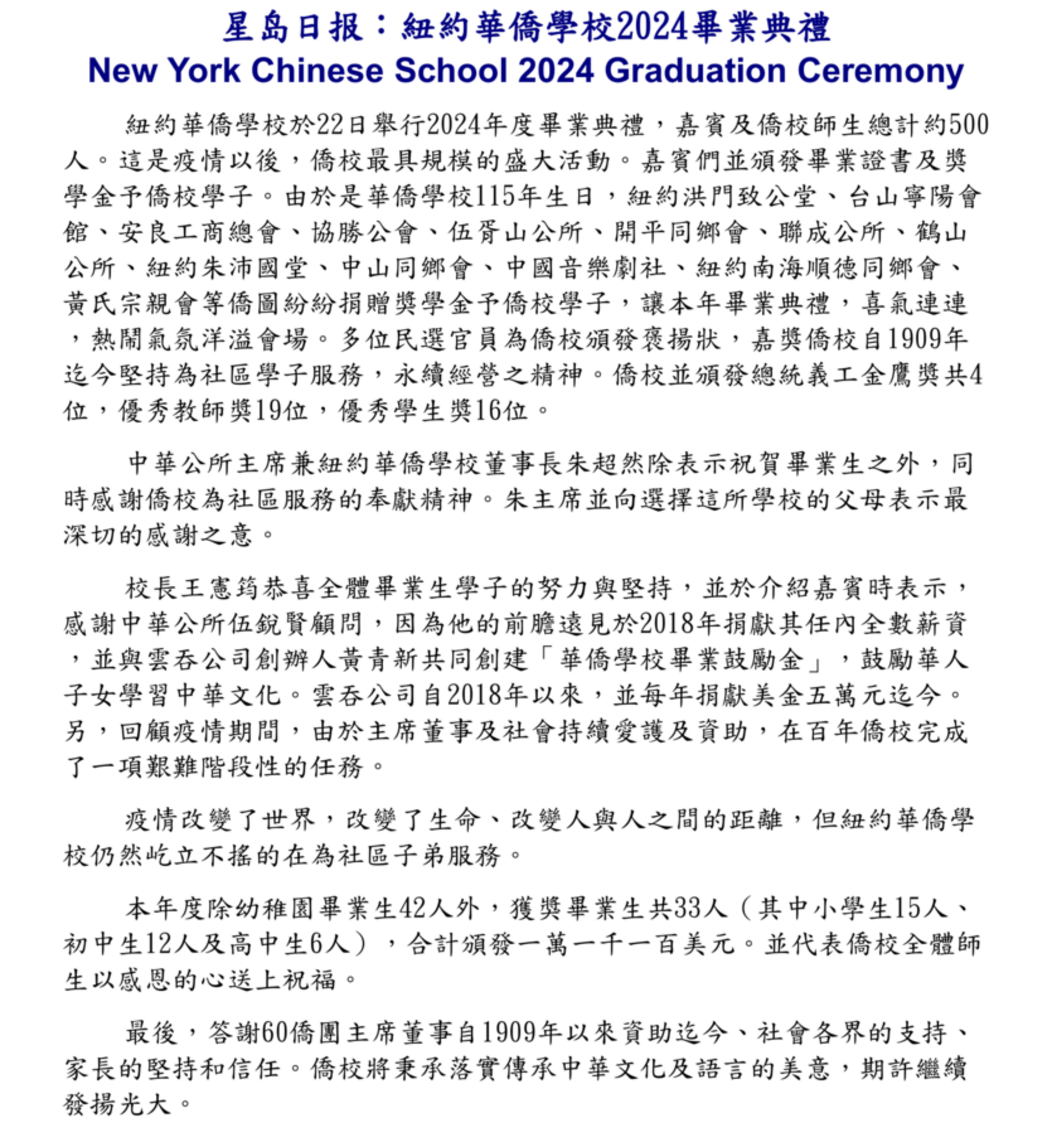 僑社星岛日报:紐約華僑學校2024畢業典禮